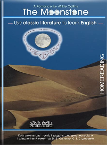 нтам, викладачам та усім, хто самостійно вивчає англійську мову, найвідоміший і найкращий роман Уілкі Коллінза «Місячний камінь». Мета посібника – допомогти читачам максимально розкрити для себе багатий художній та мовний потенціал роману. Він розрахований на рівень володіння мовою Upper Intermediate – Advanced. Основними компонентами структури посібника є оригінальний художній текст, тести і завдання для перевірки розуміння прочитаного, лексичні і мовні вправи і питання та завдання для обговорення тексту. Вперше завдання у розділі Post-Reading Discussion Section повністю побудовані на основі положень теорії аргументації. Посібник продовжує серію книг з домашнього читання, виданих видавництвом “Нова книга” у 2002-2006 роках (W. S. Maugham “Theatre”, L. M. Montgomery “Anne of Green Gables”, A. Christie “The Case of the Rich Woman”, “The Million Pound Banknote”).